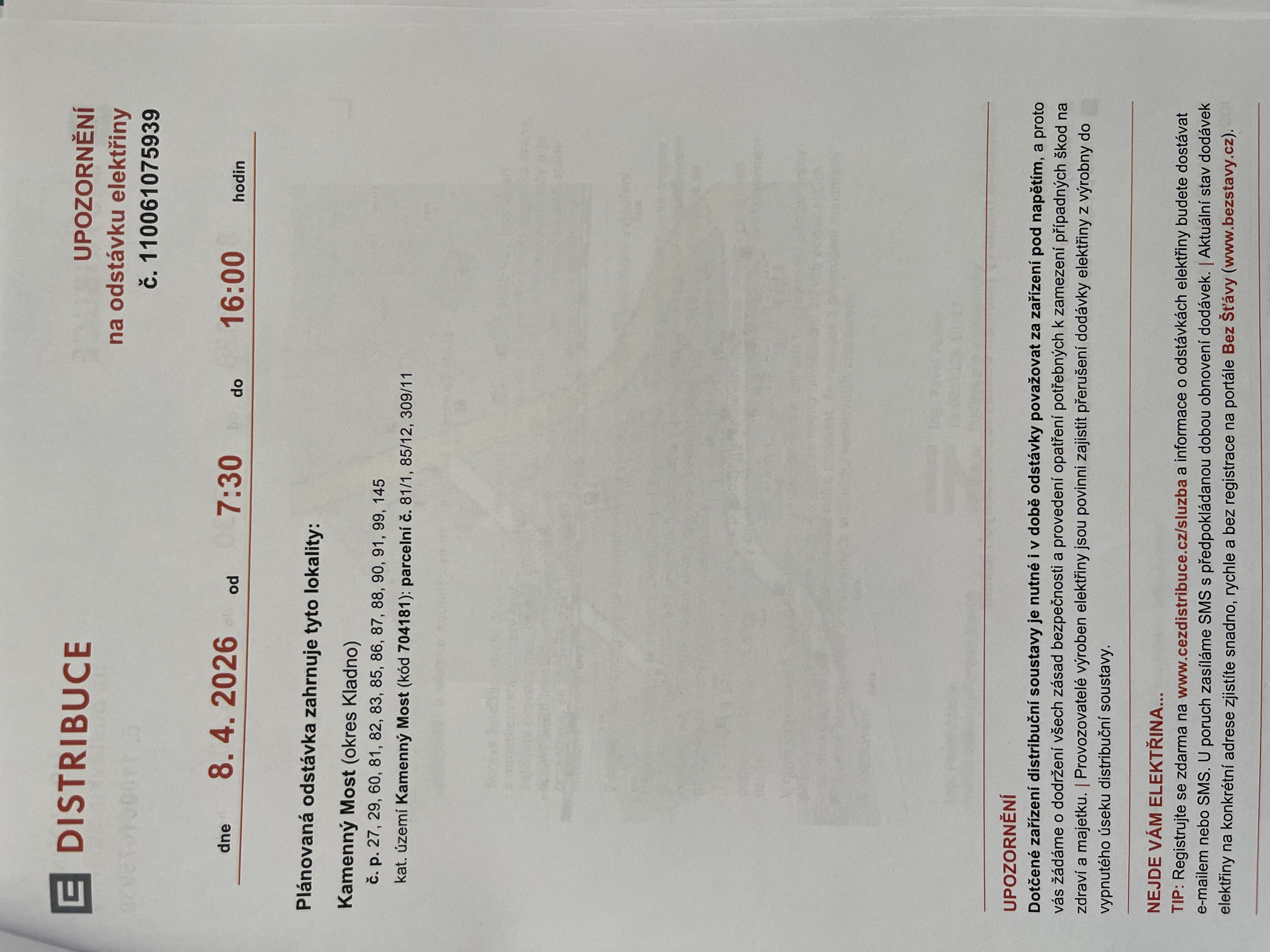 dne 8.4.2026 od 7:30 do 16:00 dojde k přerušení dodávky elektrické energie v obci Kamenný Most v lokalitách vyznačených v přílohách.